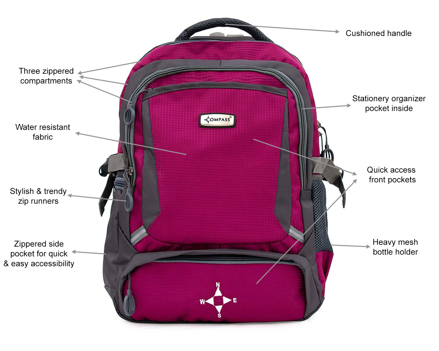 Compass Backpack M6017 Water resistantVolume capacity – 28 LitresDimensions (L x W x H) – 34 cms x 16 cms x 49 cms M.R.P.: Rs. 1799.00 Buy on Amazon